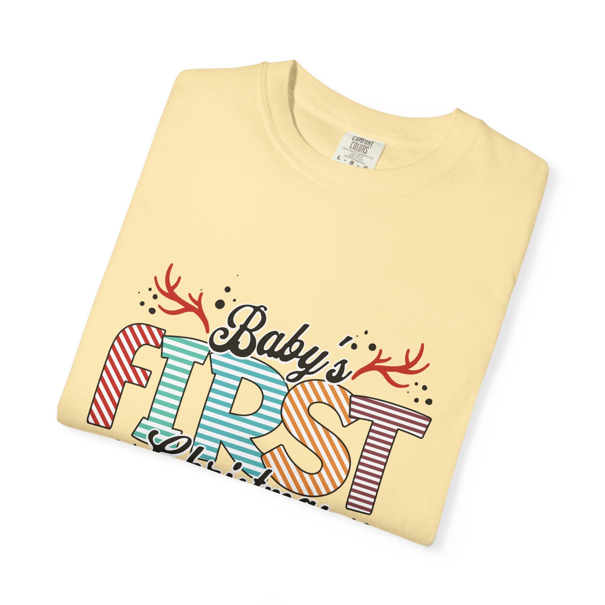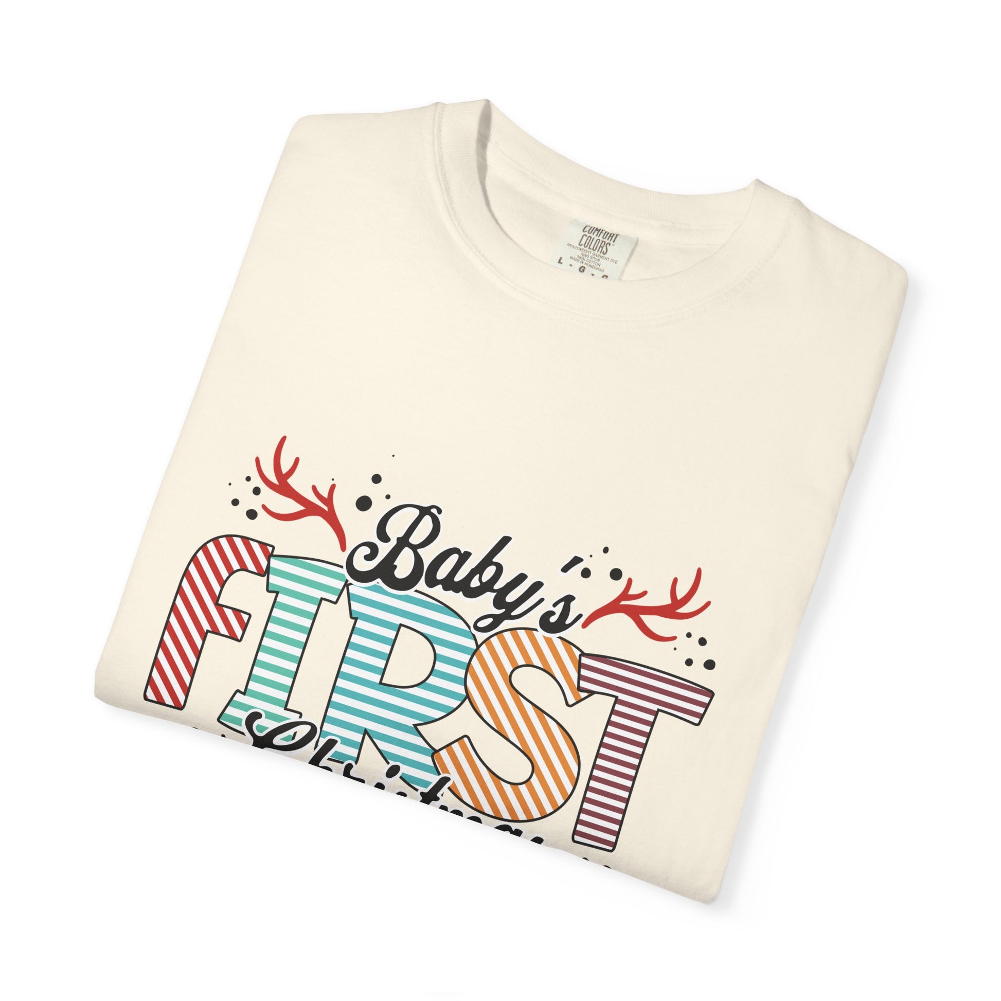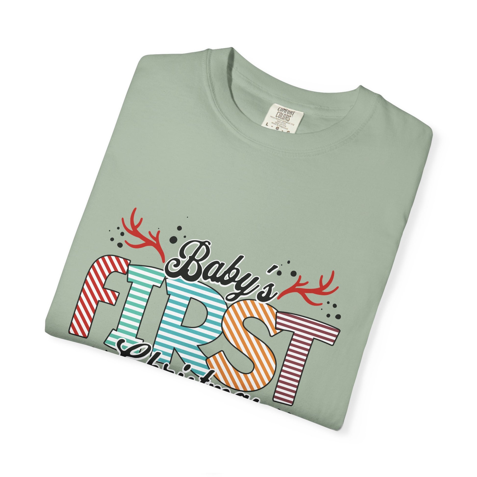 Soft, cozy, and quietly festive — this garment-dyed tee brings a gentle, handmade feel to a family’s first Christmas memories. The playful “Baby’s First Christmas” artwork uses candy-cane stripes, muted pastels, and delicate script to keep the look sweet and seasonally cheerful without feeling over the top. Wear it with leggings or under a cardigan while you hold a tiny one, pass around newborn snuggles, or gather for a low-key holiday photo that’s more about warm smiles than bright lights. The relaxed fit and worn-in color from garment-dyeing make it an easy layer for parents, grandparents, or caretakers who want holiday spirit with everyday comfort.