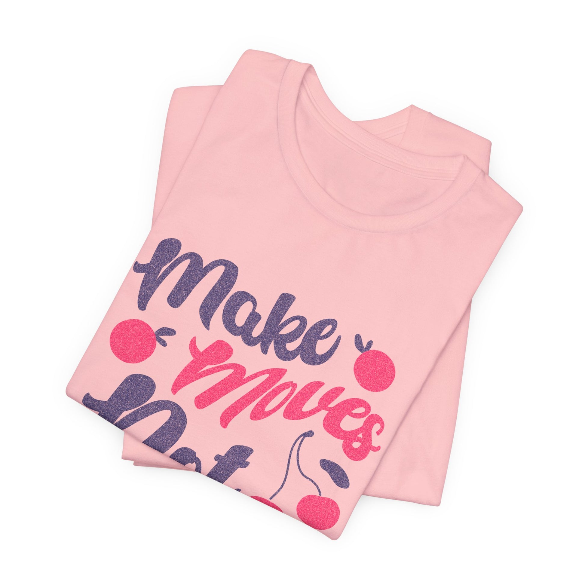 Lightweight, breathable, and built for movement — this classic jersey tee carries a hand-lettered reminder: "Make Moves Not Excuses." The soft Airlume combed cotton feels cool against the skin while the retail crew neck and side seams keep the silhouette neat and structured. Subtle cherry-accented lettering adds playful energy without overpowering your outfit. Wear it to morning walks, quick gym sessions, or layered under a jacket for a casual day out — it’s a quiet nudge toward action that fits right into an active life.